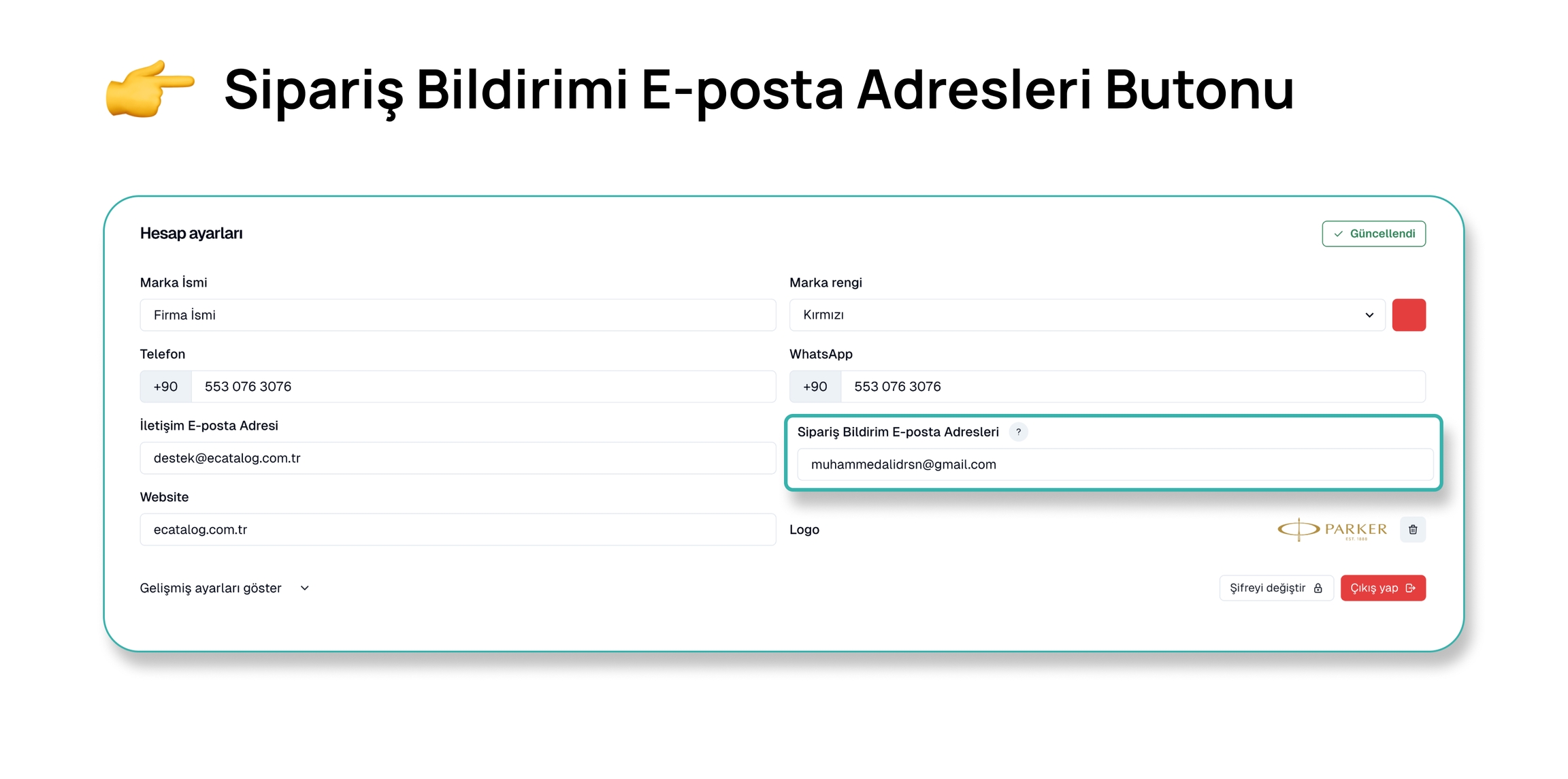 Sipariş Bildirim E-posta Adresleri: Sipariş bildirimlerinin gönderileceği e-posta adreslerini girin. Birden fazla adres eklemek isterseniz virgülle ayırmalısınız.